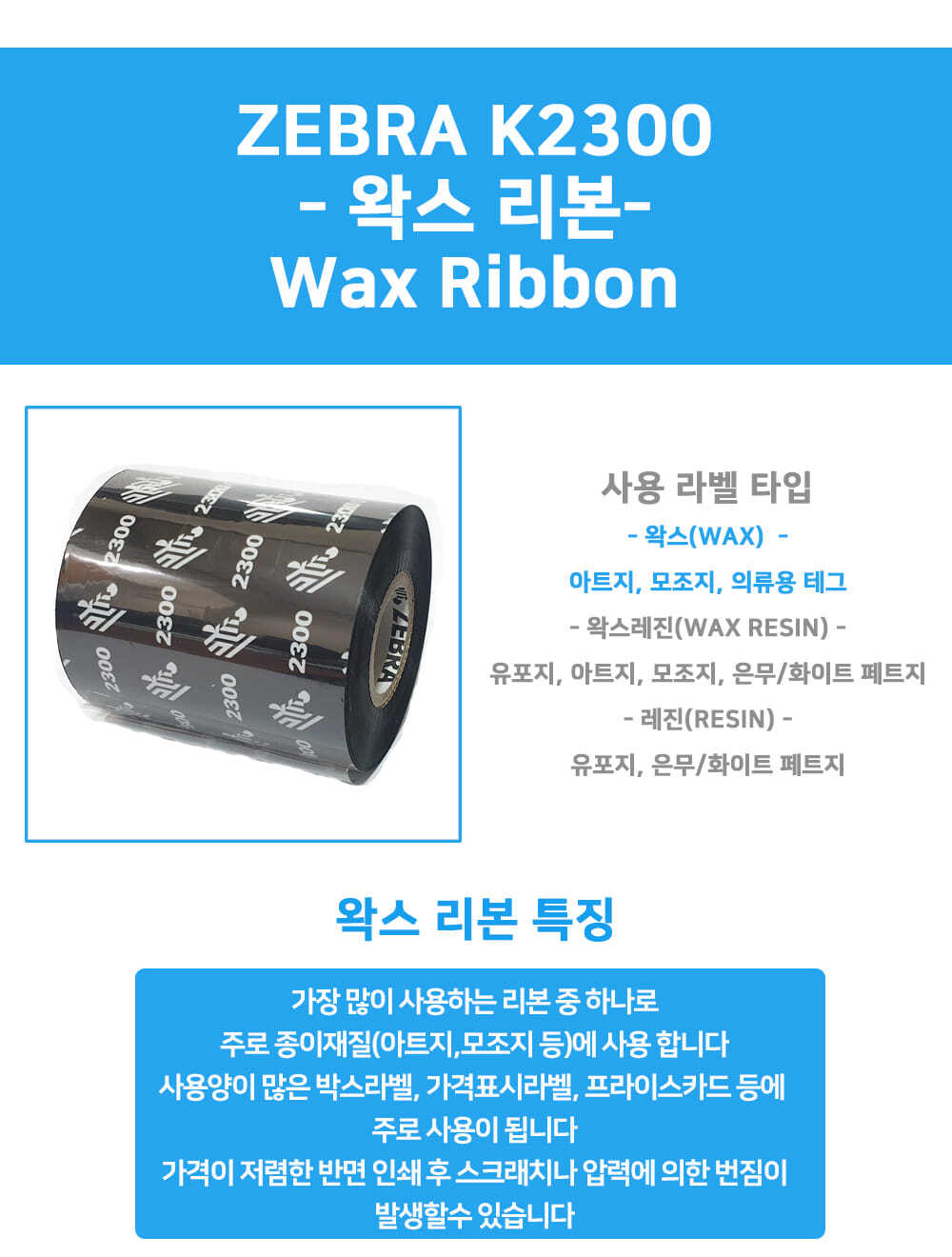 제브라 K2300, K-2300 Wax Ribbon, 지브라리본, ZebraRibbon, 왁스리본, 고속인쇄용리본, 바코드리본, 먹지, 열전사 리본, 플랫헤드 리본, 라벨 리본, 고감도 왁스