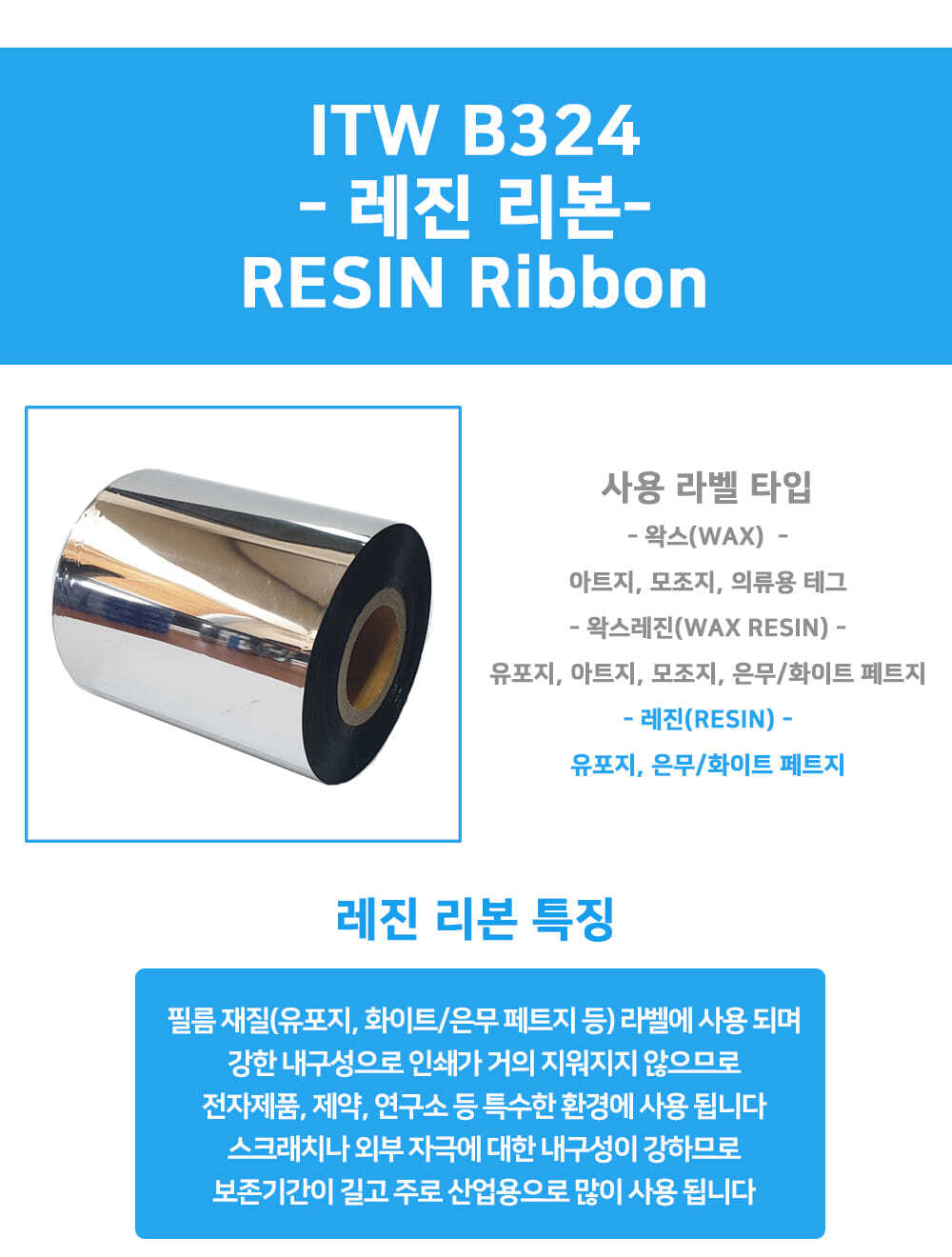 아이티더블유 B324, 레진 리본, 고내구 레진 라벨 리본, 내스크래치 라벨 리본, 내마모 라벨 리본, 내화학 라벨 리본, 고흑도 레진, 저에너지 고밀도 인쇄 레진, 합성지 라벨 리본, 코팅지 라벨 레진, 자산관리 라벨, 공정·부품 라벨, 의료·실험실 라벨, 실외·가혹환경 라벨