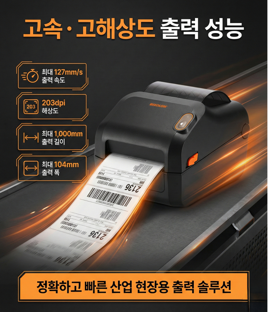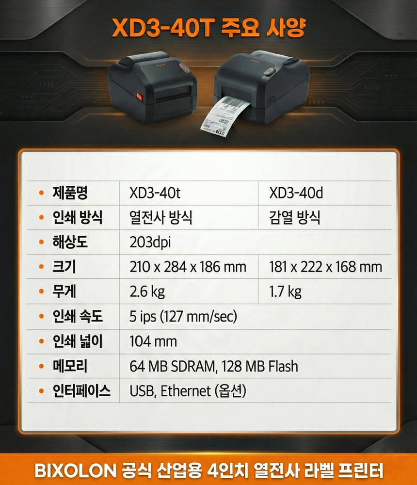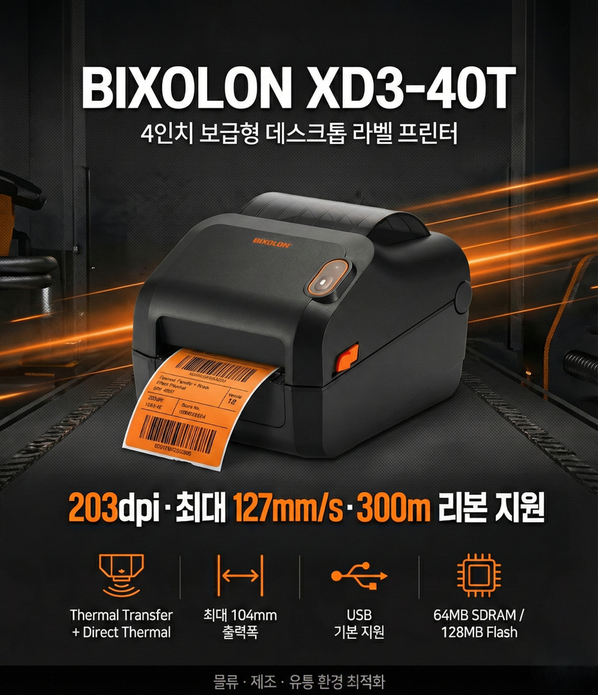 "BIXOLON XD3-40T는 203dpi 해상도와 최대 127mm/s 출력 속도를 지원하는