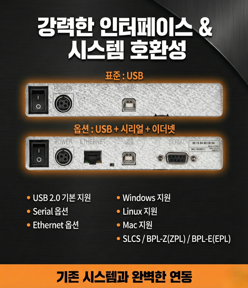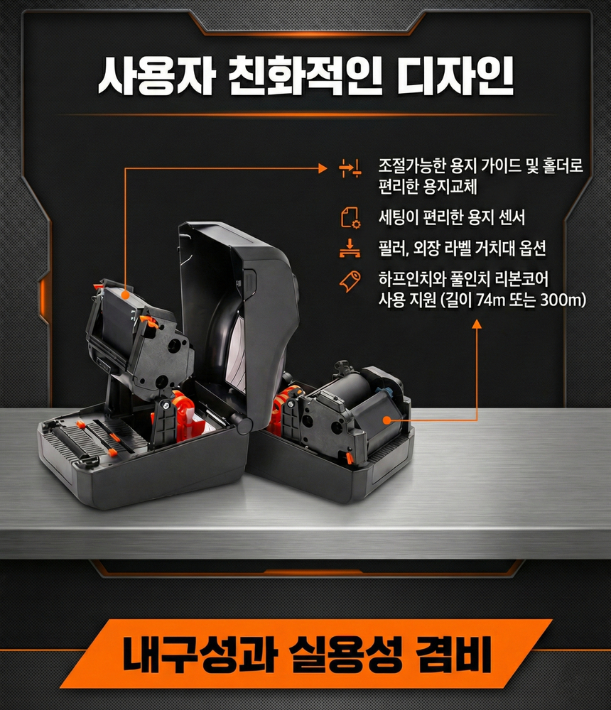 4인치 산업용 열전사·감열 겸용 데스크탑 라벨 프린터입니다. "