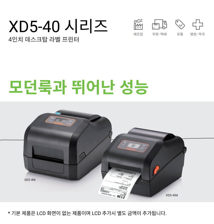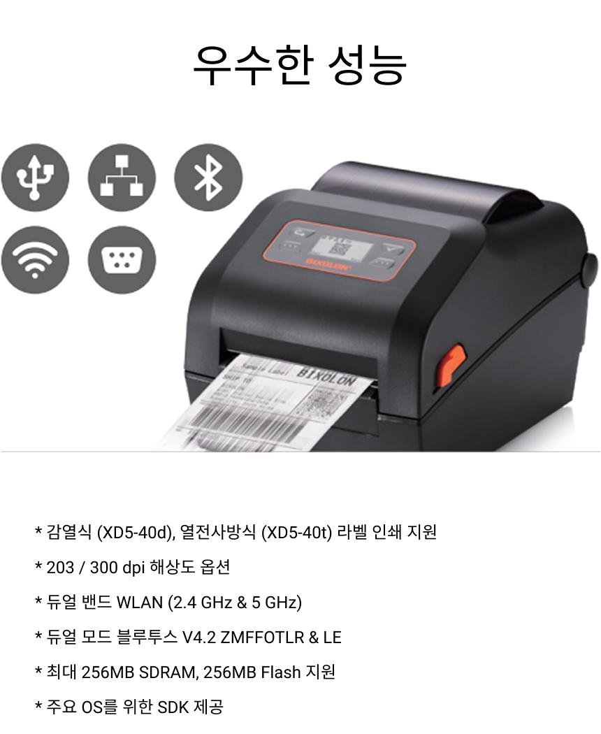 BIXOLON XD5-40D, XD5-40D 라벨프린터, XD5-40D 바코드 프린터, XD5-43D 300dpi, 4인치 라벨프린터, 데스크탑 라벨프린터, 무선 라벨프린터, 감열 라벨프린터, 7ips 라벨프린터, 203dpi, 300dpi 라벨프린터, 이더넷, 와이파이, 물류창고 바코드 라벨프린터, 입출고 라벨프린, 유통센터 팔렛 박스 라벨, 재고라벨, 매장 가격 상품라벨, 택배 송장